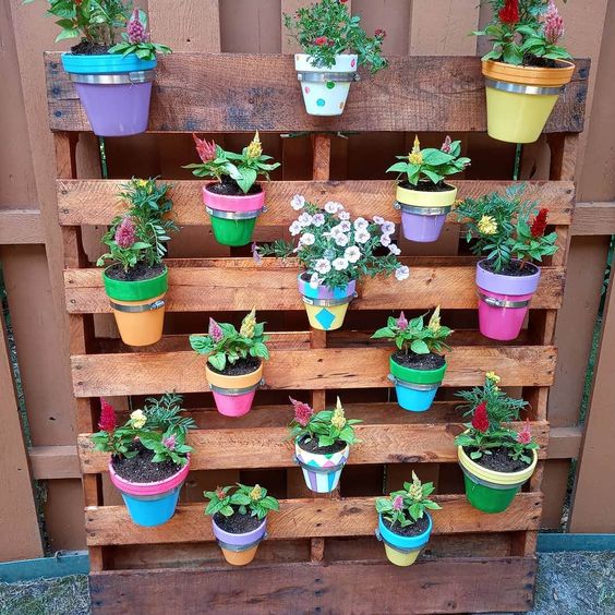 Puedes usar los palets como soporte para las macetas, pintándolas de diversos colores para un resultado alegre y juguetón. Es una opción ideal para dar vida a una terraza llena de flores y diversión.