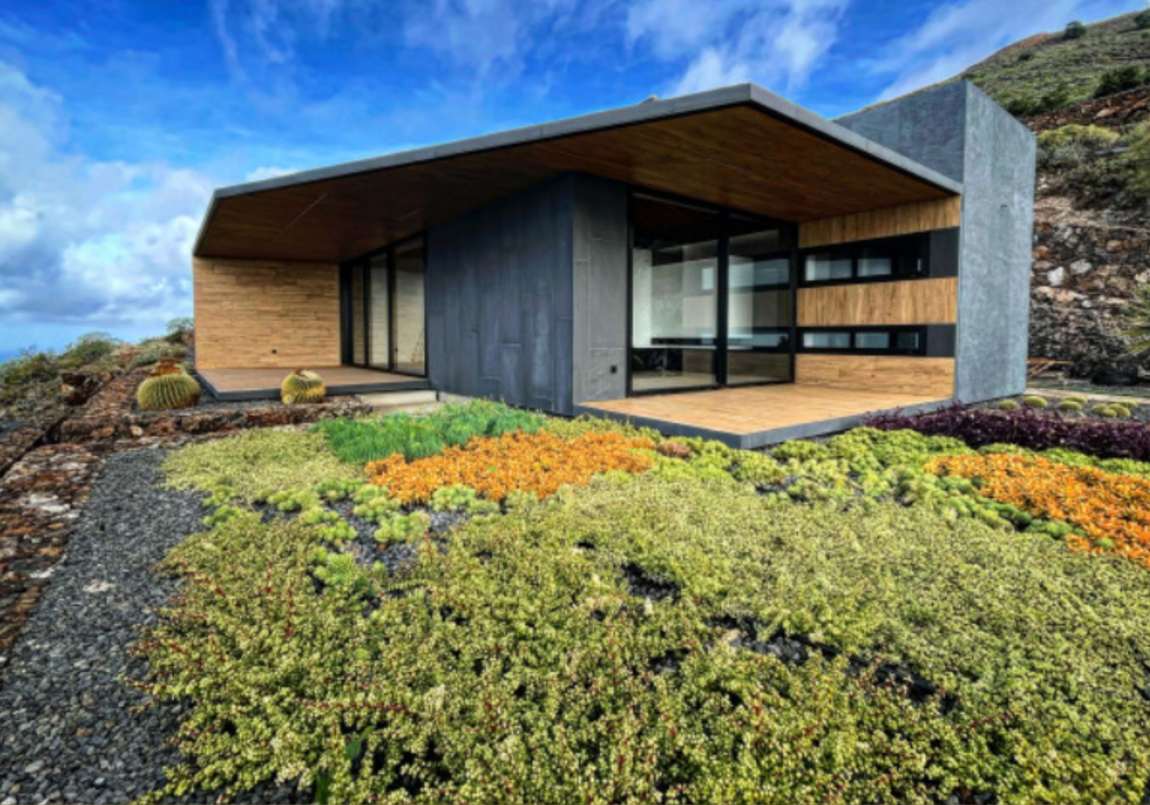 En la Isla de La Palma, Canarias, se ha creado un jardín de bajo consumo hídrico utilizando plantas como dragos, cactus bola y suculentas. Estas plantas se integran perfectamente con la arquitectura de la vivienda y requieren poco riego, lo que facilita su mantenimiento. La elección de plantas resistentes al clima de la isla garantiza la sostenibilidad en un entorno con precipitaciones escasas y una gran cantidad de sol anual.