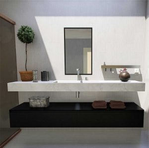 -Sin duda, un mueble bajo el lavabo es un elemento muy útil para el almacenaje. Existen infinidad de modelos para elegir, incluso se pueden hacer a medida, pero nos parecen muy prácticos los que van suspendidos, anclados a la pared, dejando el suelo libre. Facilitan la limpieza y aportan ligereza visual.